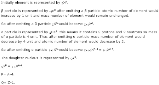 (i) a particle is represented by 2He4 this means it contains 2 protons and 2 neutrons so mass of a particle is 4 unit. Thus after emitting a particle mass number of element would decrease by 4 unit. (ii) p particle is represented by -1e° so after emitting a β particle mass number of element would remain unchanged. (iii)Y radiations have no charge and no mass so after emitting a γ-radiation mass number of element remain unchanged.