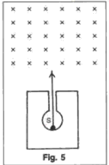 16. In fig. 5 shows a mixed source S of alpha and beta particles in a thick lead container. The particles pass through a magnetic field in a direction perpendicular to the plane of paper (inwards as shown by x). State and show in the diagram how the particles get affected.