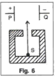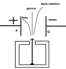 17. In fig. 6 shows a radioactive source S in a thick lead container . The radiations pass through an electric field between the plates P and Q. Complete the diagram to show the paths of α , β and γ radiations.