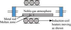 This method is based on the principle that impurities are more soluble in the molten state of metal (the melt) than in the solid state. In the process of zone refining, a circular mobile heater is fixed at one end of a rod of impure metal. As the heater moves, the molten zone of the rod also moves with it. As a result, pure metal crystallizes out of the melt and the impurities pass onto the adjacent molten zone. This process is repeated several times, which leads to the segregation of impurities at one end of the rod. Then, the end with the impurities is cut off. Silicon, boron, gallium, indium etc. can be purified by this process.