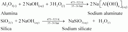 Bauxite usually contains silica, iron oxide, and titanium oxide as impurities. In the process of leaching, alumina is concentrated by digesting the powdered ore with a concentrated solution of NaOH at 473-523 K and 35-36 bar. Under these conditions, alumina (Al2O3) dissolves as sodium meta-aluminate and silica (SiO2) dissolves as sodium silicate leaving the impurities behind.