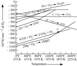 Ans : Above 1350°C, the standard Gibbs free energy of formation of Al2O3 from Al is less than that of MgO from Mg. Therefore, above 1350°C, Al can reduce MgO.