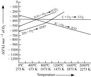 Reduction of ZnO to Zn is usually carried out at 1673 K. From the above figure, it can be observed that above 1073 K, the Gibbs free energy of formation of CO from C and above 1273 K, the Gibbs free energy of formation of CO2 from C is lesser than the Gibbs free energy of formation of ZnO. Therefore, C can easily reduce ZnO to Zn.