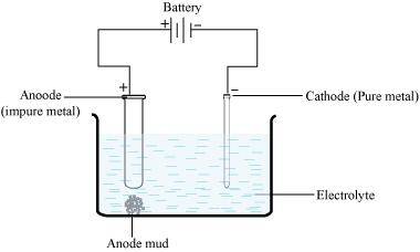 Electrolytic refining is the process of refining impure metals by using electricity. In this process, impure metal is made the anode and a strip of pure metal is made the cathode. A solution of a soluble salt of the same metal is taken as the electrolyte. When an electric current is passed, metal ions from the electrolyte are deposited at the cathode as pure metal and the impure metal from the anode dissolves into the electrolyte in the form of ions. The impurities present in the impure metal gets collected below the anode. This is known as anode mud.