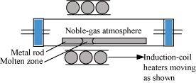 This method is based on the principle that impurities are more soluble in the molten state of metal (the melt) than in the solid state. In the process of zone refining, a circular mobile heater is fixed at one end of a rod of impure metal. As the heater moves, the molten zone of the rod also moves along with it. As a result, pure metal crystallizes out of the melt and the impurities pass to the adjacent molten zone. This process is repeated several times, which leads to the segregation of impurities at one end of the rod. Then, the end with the impurities is cut off. Silicon, boron, gallium, indium etc. can be purified by this process.