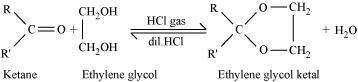 Ketones react with ethylene glycol in the presence of dry HCl gas to give a cyclic product known as ethylene glycol ketals.