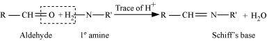 Aldehydes and ketones on treatment with primary aliphatic or aromatic amines in the presence of trace of an acid yields a Schiff’s base.