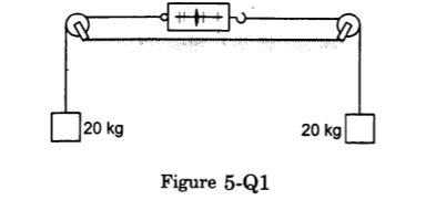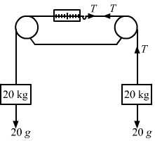 - Qstn #8The figure shows a light spring balance connected to two blocks of mass 20 kg each. The graduations in the balance measure the tension in the spring.