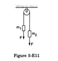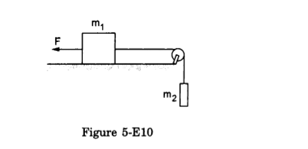 - Qstn #27In figure (5-E11), m1 = 5 kg, m2 = 2 kg and F = 1 N. Find the acceleration of either block. Describe the motion of m1 if the string breaks but F continues to act.