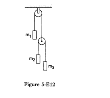 - Qstn #28Let m1 = 1 kg, m2 = 2 kg and m3 = 3 kg in figure (5-E12). Find the accelerations of m1, m2 and m3. The string from the upper pulley to m1 is 20 cm when the system is released from rest. How long will it take before m1 strikes the pulley?