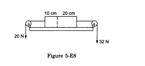 - Qstn #24Figure (5-E8) shows a uniform rod of length 30 cm and mass 3.0 kg. The strings shown in the figure are pulled by constant forces of 20 N and 32 N. Find the force exerted by the 20 cm part of the rod on the 10 cm part. All the surfaces are smooth and the strings and the pulleys are light.