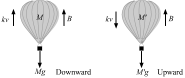 - Qstn #19The force of buoyancy exerted by the atmosphere on a balloon is B in the upward direction and remains constant. The force of air resistance on the balloon acts opposite the direction of velocity and is proportional to it. The balloon carries a mass M and is found to fall to the earth’s surface with a constant velocity v. How much mass should be removed from the balloon so that it may rise with a constant velocity v?Ans : Let M be mass of the balloon.