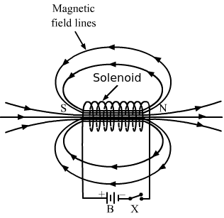 - Qstn #4Compare the direction of the magnetic field inside a solenoid with that of the field there if the solenoid is replaced by its equivalent combination of north pole and south pole.Ans : The direction of the magnetic field is the same in both cases, that is, inside a solenoid and inside a bar magnet. In a solenoid, magnetic field lines are directed from one end to the other internally and externally, so they are in the equivalent combination of north and south poles (as shown in figure).