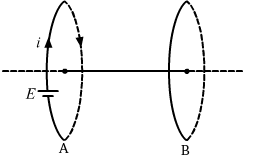 Consider loops A and B placed coaxially as shown above. Let the direction of the current in loop A be clockwise when the battery is connected to it. According to the right-hand screw rule, the direction of the magnetic field due to this current will be towards left, as seen from the side of B. Due to a sudden flux through loop B, a current will be induced in it. It will only be induced for a moment when the current suddenly jumps from zero to a constant value. After it has attained a constant value, there will be no induced current. Now, according to Lenz's law, the direction of the induced current in loop B will be such that it will oppose the magnetic field due to loop A. Hence, a current will be induced in anti-clockwise direction in loop B. The induced current will flow in loop B as soon as the current grows in loop A and will end when the current through loop A becomes zero. Because the directions of the currents in the loops are opposite, they will repel each other.