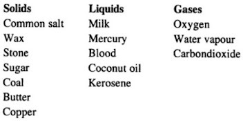 Oxygen, milk, common salt, wax, stone, water vapour, carbon-dioxide, sugar, mercury, coal, blood, butter, copper, coconut oil, kerosene.
