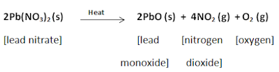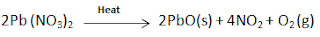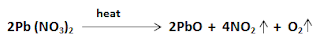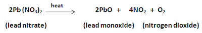 e.g. When lead nitrate is heated, it breaks into lead monoxide, nitrogen dioxide and oxygen.