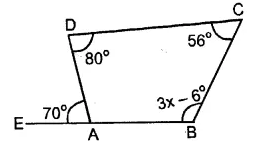 The following figure shows a quadrilateral in which sides AB and DC are parallel. If ∠A : ∠D = 4 : 5, ∠B = (3x - 15)° and ∠C = (4x + 20)°, find each angle of the quadrilateral ABCD.