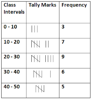 Taking class intervals 0-10, 10-20, ......... 40-50 ; construct a frequency table.Ans :