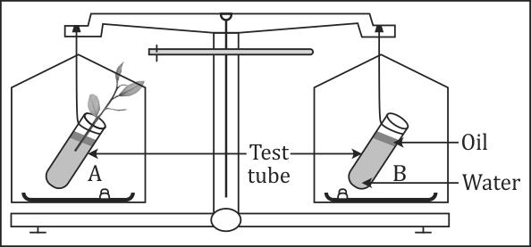 Reason: In test tube A, loses weight due to the plant transpires and loses water. In B there is no plant so there is no transpiration and the oil on the surface prevents direct evaporation and so weight remains unchanged.