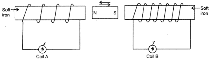 - #4-cA magnet kept at the centre of two coils A and B is moved to and fro as shouni in the diagram. The two galvanometers show deflection.