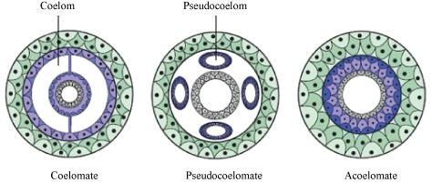 Ans : Coelom is a fluid filled space between the body wall and digestive tract. The presence or absence of body cavity or coelom plays a very important role in the classification of animals. Animals that possess a fluid filled cavity between body wall and digestive tract are known as coelomates. Annelids, mollusks, arthropods, echinodermates, and chordates are examples of coelomates. On the other hand, the animals in which the body cavity is not lined by mesoderm are known as pseudocoelomates. In such animals, mesoderm is scattered in between ectoderm and endoderm. Aschelminthes is an example of pseudocoelomates. In certain animals, the body cavity is absent. They are known as acoelomates. An example of acoelomates is platyhelminthes.