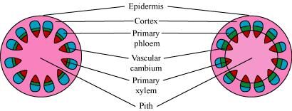 Ans : In woody dicots, the strip of cambium present between the primary xylem and phloem is called the interfascicular cambium. The interfascicular cambium is formed from the cells of the medullary rays adjoining the interfascicular cambium. This results in the formation of a continuous cambium ring. The cambium cuts off new cells toward its either sides. The cells present toward the outside differentiate into the secondary phloem, while the cells cut off toward the pith give rise to the secondary xylem. The amount of the secondary xylem produced is more than that of the secondary phloem.