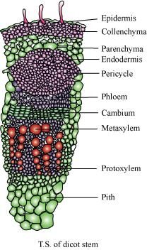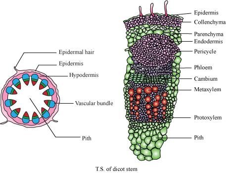 Ans : The dicot stem is characterised by the presence of conjoint, collateral, and open vascular bundles, with a strip of cambium between the xylem and phloem. The vascular bundles are arranged in the form of a ring, around the centrally-located pith. The ground tissue is differentiated into the collenchyma, parenchyma, endodermis, pericycle, and pith. Medullary rays are present between the vascular bundles.