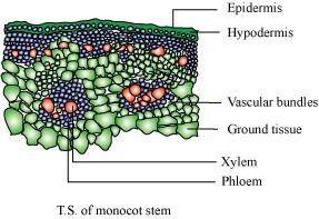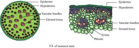 The monocot stem is characterised by conjoint, collateral, and closed vascular bundles, scattered in the ground tissue containing the parenchyma. Each vascular bundle is surrounded by sclerenchymatous bundle-sheath cells. Phloem parenchyma is absent and water-containing cavities are present.