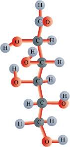 In the above ball and stick model of D-glucose, the oxygen atoms are represented by red balls, hydrogen atoms by blue balls, while carbon atoms are represented by grey balls.