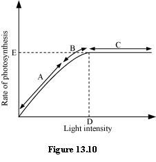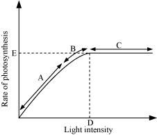 Ans : Point D represents the optimum point and gives the light intensity at which the maximum photosynthesis is recorded. The rate of photosynthesis remains constant after this point, even though the intensity of light increases in region C.