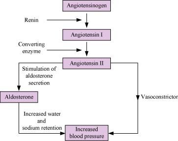 Renin converts the angiotensinogen in blood into angiotensin I and further into angiotensin II. Angiotensin II is a powerful vasoconstrictor that increases the glomerular blood pressure and filtration rate. Angiotensin II also stimulates the adrenal cortex of the adrenal gland to produce aldosterone. Aldosterone increases the rate of absorption of sodium ions and water from the distal convoluted tubule and the collecting duct. This also leads to an increase in blood pressure and glomerular filtration rate. This mechanism, known as renin-angiotensin mechanism, ultimately leads to an increased blood pressure.