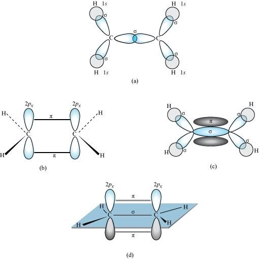 The remaining two sp2 orbitals of each carbon atom form a sp2-s sigma bond with two hydrogen atoms. The unhybridized orbital of one carbon atom undergoes sidewise overlap with the orbital of a similar kind present on another carbon atom to form a weak ``\pi``-bond.