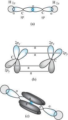 The two unhybridized 2p-orbitals of the first carbon undergo sidewise overlap with the 2p orbital of another carbon atom, thereby forming two pi (``\pi``) bonds between carbon atoms. Hence, the triple bond between two carbon atoms is made up of one sigma and two ``\pi``-bonds.