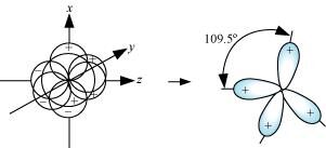 Four sp3 hybrid orbitals are formed by intermixing one s-orbital with three p-orbitals. The four sp3 hybrid orbitals are arranged in the form of a tetrahedron as: