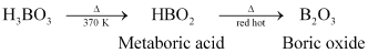 Ans : On heating orthoboric acid (H3BO3) at 370 K or above, it changes to metaboric acid (HBO2). On further heating, this yields boric oxide B2O3.