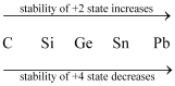 The electronic configuration of group 14 elements is ns2 np2. Therefore, the most common oxidation state exhibited by them should be +4. However, the +2 oxidation state becomes more and more common on moving down the group. C and Si mostly show the +4 state. On moving down the group, the higher oxidation state becomes less stable. This is because of the inert pair effect. Thus, although Ge, Sn, and Pb show both the +2 and + 4 states, the stability of the lower oxidation state increases and that of the higher oxidation state decreases on moving down the group.