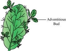 The leaves of Bryophyllum plants bear several adventitious buds on their margins. These leaf buds have the ability to grow and develop into tiny plants when the leaves get detached from the plant and come in contact with moist soil.