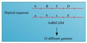 For example, if an organism is heterozygous at four loci with four characters, say Aa, Bb, Cc, Dd, then during meiosis, it will segregate to form 8 separate gametes.
