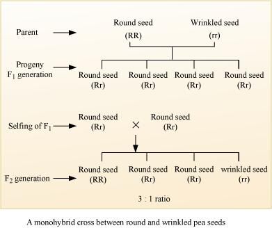 For example, when pea plants with round seeds (RR) are crossed with plants with wrinkled seeds (rr), all seeds in F1 generation were found to be round (Rr). When these round seeds were self fertilized, both the round and wrinkled seeds appeared in F2 generation in 3: 1 ratio. Hence, in F1 generation, the dominant character (round seeds) appeared and the recessive character (wrinkled seeds) got suppressed, which reappeared in F2 generation.
