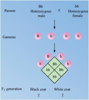Ans : In guinea pigs, heterozygous male with black coat colour (Bb) is crossed with the female having white coat colour (bb). The male will produce two types of gametes, B and b, while the female will produce only one kind of gamete, r. The genotypic and phenotypic ratio in the progenies of F1 generation will be same i.e., 1:1.
