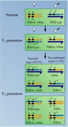 For example, a cross between yellow body and white eyes and wild type parent in a Drosophila will produce wild type and yellow white progenies. It is because yellow bodied and white eyed genes are linked. Therefore, they are inherited together in progenies.
