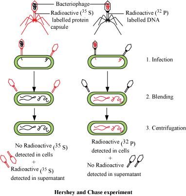 They grew some bacteriophages on a medium containing radioactive phosphorus (32P) to identify DNA and some on a medium containing radioactive sulphur (35S) to identify protein. Then, these radioactive labelled phages were allowed to infect E.coli bacteria. After infecting, the protein coat of the bacteriophage was separated from the bacterial cell by blending and then subjected to the process of centrifugation.