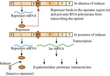 After sometime, when the level of inducer decreases as it is completely metabolized by enzymes, it causes synthesis of the repressor from regulator gene. The repressor binds to the operator gene and prevents RNA polymerase from transcribing the operon. Hence, the transcription is stopped. This type of regulation is known as negative regulation.