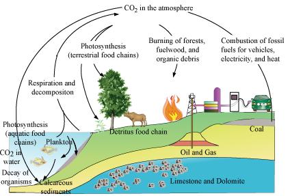 Ans : The carbon cycle is an important gaseous cycle which has its reservoir pool in the atmosphere. All living organisms contain carbon as a major body constituent. Carbon is a fundamental element found in all living forms. All biomolecules such as carbohydrates, lipids, and proteins required for life processes are made of carbon. Carbon is incorporated into living forms through a fundamental process called ‘photosynthesis’. Photosynthesis uses sunlight and atmospheric carbon dioxide to produce a carbon compound called ‘glucose’. This glucose molecule is utilized by other living organisms. Thus, atmospheric carbon is incorporated in living forms. Now, it is necessary to recycle this absorbed carbon dioxide back into the atmosphere to complete the cycle. There are various processes by which carbon is recycled back into the atmosphere in the form of carbon dioxide gas. The process of respiration breaks down glucose molecules to produce carbon dioxide gas. The process of decomposition also releases carbon dioxide from dead bodies of plants and animals into the atmosphere. Combustion of fuels, industrialization, deforestation, volcanic eruptions, and forest fires act as other major sources of carbon dioxide.