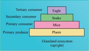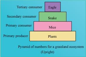 Pyramid of numbers:It is a graphical representation of the number of individuals present at each trophic level in a food chain of an ecosystem. The pyramid of numbers can be upright or inverted depending on the number of producers. For example, in a grassland ecosystem, the pyramid of numbers is upright. In this type of a food chain, the number of producers (plants) is followed by the number of herbivores (mice), which in turn is followed by the number of secondary consumers (snakes) and tertiary carnivores (eagles). Hence, the number of individuals at the producer level will be the maximum, while the number of individuals present at top carnivores will be least.