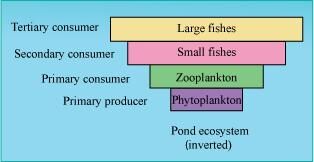 A pyramid of biomass is a graphical representation of the total amount of living matter present at each trophic level of an ecosystem. It can be upright or inverted. It is upright in grasslands and forest ecosystems as the amount of biomass present at the producer level is higher than at the top carnivore level. The pyramid of biomass is inverted in a pond ecosystem as the biomass of fishes far exceeds the biomass of zooplankton (upon which they feed).