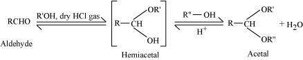 When aldehydes are treated with two equivalents of a monohydric alcohol in the presence of dry HCl gas, hemiacetals are produced that further react with one more molecule of alcohol to yield acetal.