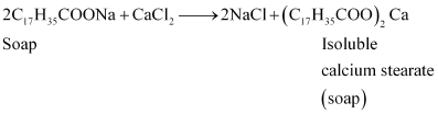 Ans : Soaps are sodium or potassium salts of long-chain fatty acids. Hard water contains calcium and magnesium ions. When soaps are dissolved in hard water, these ions displace sodium or potassium from their salts and form insoluble calcium or magnesium salts of fatty acids. These insoluble salts separate as scum.