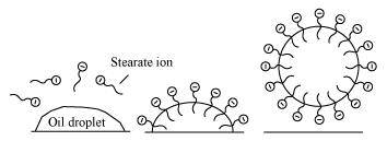 Ans : Soap molecules form micelles around an oil droplet (dirt) in such a way that the hydrophobic parts of the stearate ions attach themselves to the oil droplet and the hydrophilic parts project outside the oil droplet. Due to the polar nature of the hydrophilic parts, the stearate ions (along with the dirt) are pulled into water, thereby removing the dirt from the cloth.