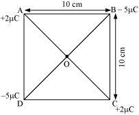 Ans : The given figure shows a square of side 10 cm with four charges placed at its corners. O is the centre of the square.